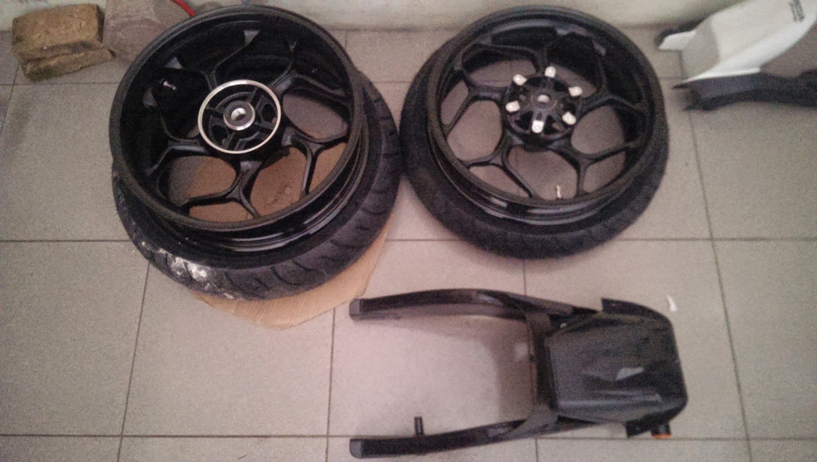 paket swing arm banana, velg axio model ninja 250fi, plus ban zeneos zn91 110/70 dan 150/60.. batanya gak ikut yaa..hehehe